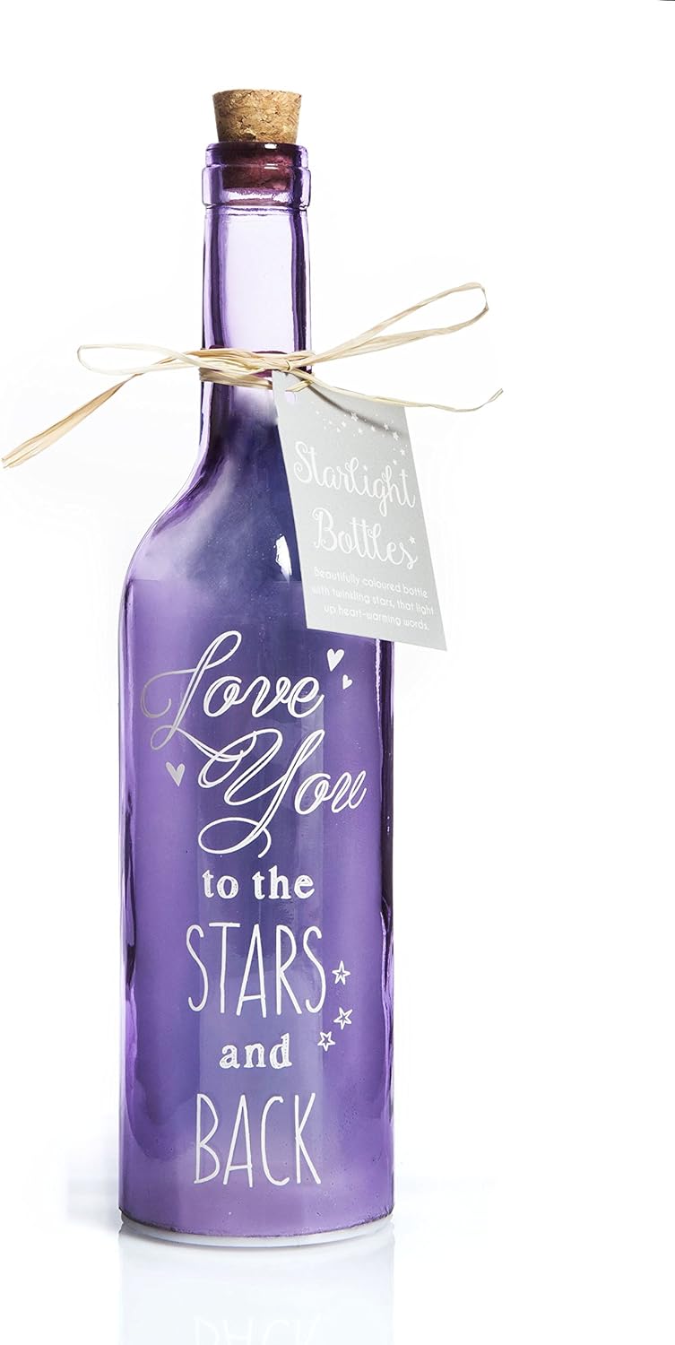 Show a special someone how much you love them with this beautiful purple starlight bottle. With a heart-warming sentiment “Love You To The Stars And Back” and gorgeous homely star effect LED lights, this glass wine bottle will brighten up their day and home. Complete with a gift tag tied beautifully with hessian, this is a beautiful gift for wonderful friends and family on their birthday, Christmas or just because you love them.