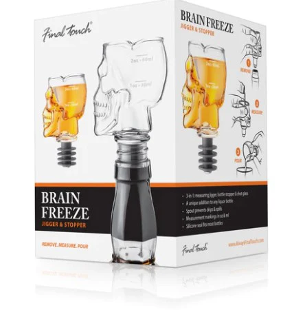 - Fill decanter and shot glasses with liquor to enhance the detail of the skull.