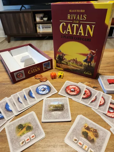 Rivals for CATAN® puts you in charge of one of the two factions developing newly-settled CATAN®. Use your under card mix to create your own principality. Explore and settle new lands, acquiring resources through card play and the luck of the dice. Use gold, response combinations, and trade to develop your domain. Expand your settlements and cities, recruit heroes, and defend your lands through politics, invention, and intrigue. Your cunning and a dash of luck decides who will be Prince of CATAN®.