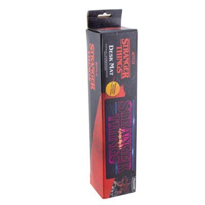 Upgrade your desk space with this Stranger Things Classic Logo Desk Mat.The black and red rubber desk mat features the Stranger Things logo against a rural Hawkins scene. Along the bottom of the mat are silhouettes of six of the main characters on bikes – Lucas, Mike, Eleven, Dustin, Will and Max. The Demogorgon lurks in the background.