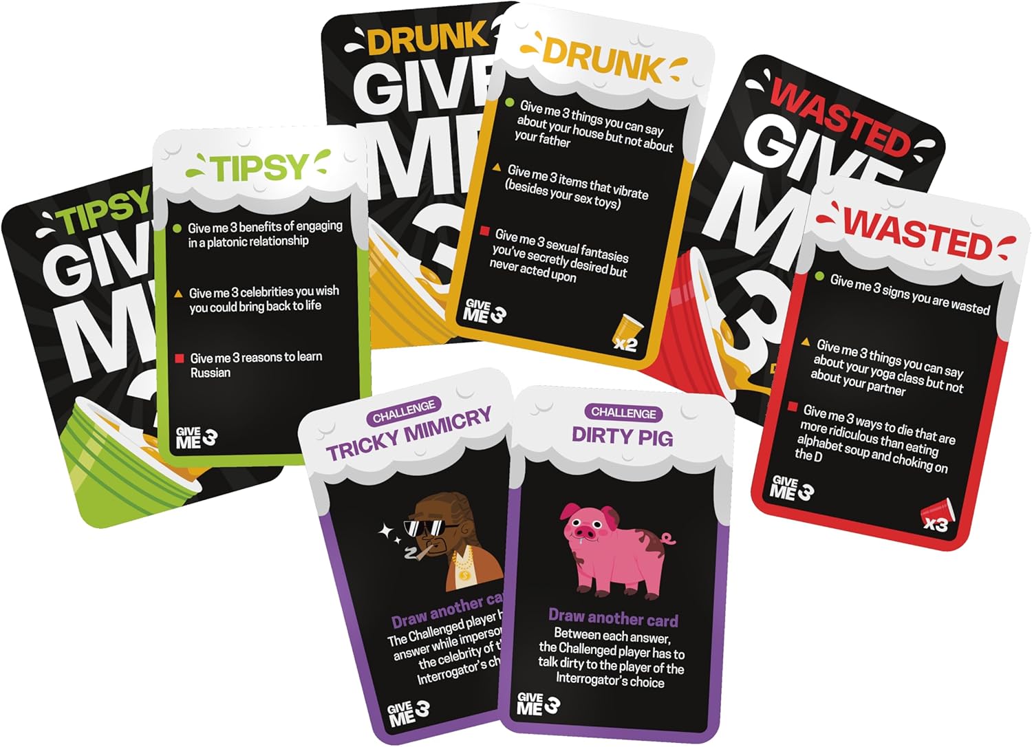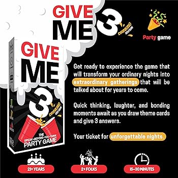 - LAUGH & HAVE FUN WITH GIVE ME 3 – THE ULTIMATE PARTY GAME! Start the party with hilarious questions like “Give me 3 things you can say about a drink but not about your partner?” Enjoy endless laughter, wit, and wild moments.