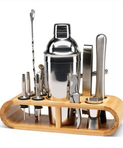 From the classic cocktail shaker and jigger for precise measurements to the essential strainer and mixing spoon, each tool is designed to ensure flawless cocktail preparation. The set also includes convenient accessories like ice tongs, a corkscrew, pestle for muddling, and four pourers, all elegantly presented in a sophisticated wooden display case.