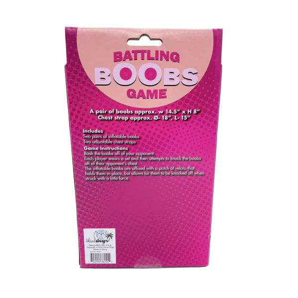 Enjoy hours of inflatable fun with Battling Boobs. Challenge your friends to a boob-bumping battle with these two sets of jiggly, inflatable breast buddies. Hours of breast-bustin’ giggles await. Bash the boobs off of your opponent for the win!