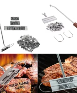 The BBQ branding iron comes with all the letters in the alphabet and spaces for you to spell out just about anything in your meat. The set includes a long metal rod with a wooden handle, a metal plate letter holder for you to spell your name etc. 55 metal letter tiles, 8 blank space tiles and 2 wire lock clips that hold all the letters in place.