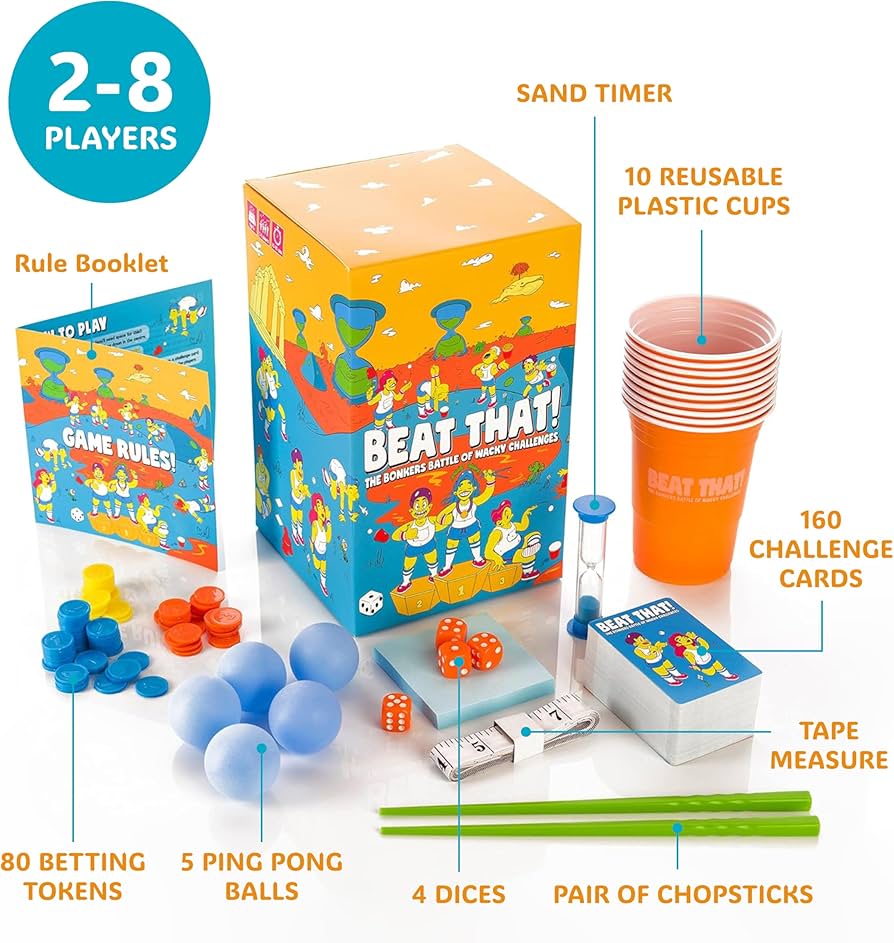 160 HILARIOUS CHALLENGES – Fantastic fun at Christmas gatherings, family game nights and dinner parties. Plus, Beat That! is a fab stocking filler, Secret Santa present or Christmas gift for family & friends too!