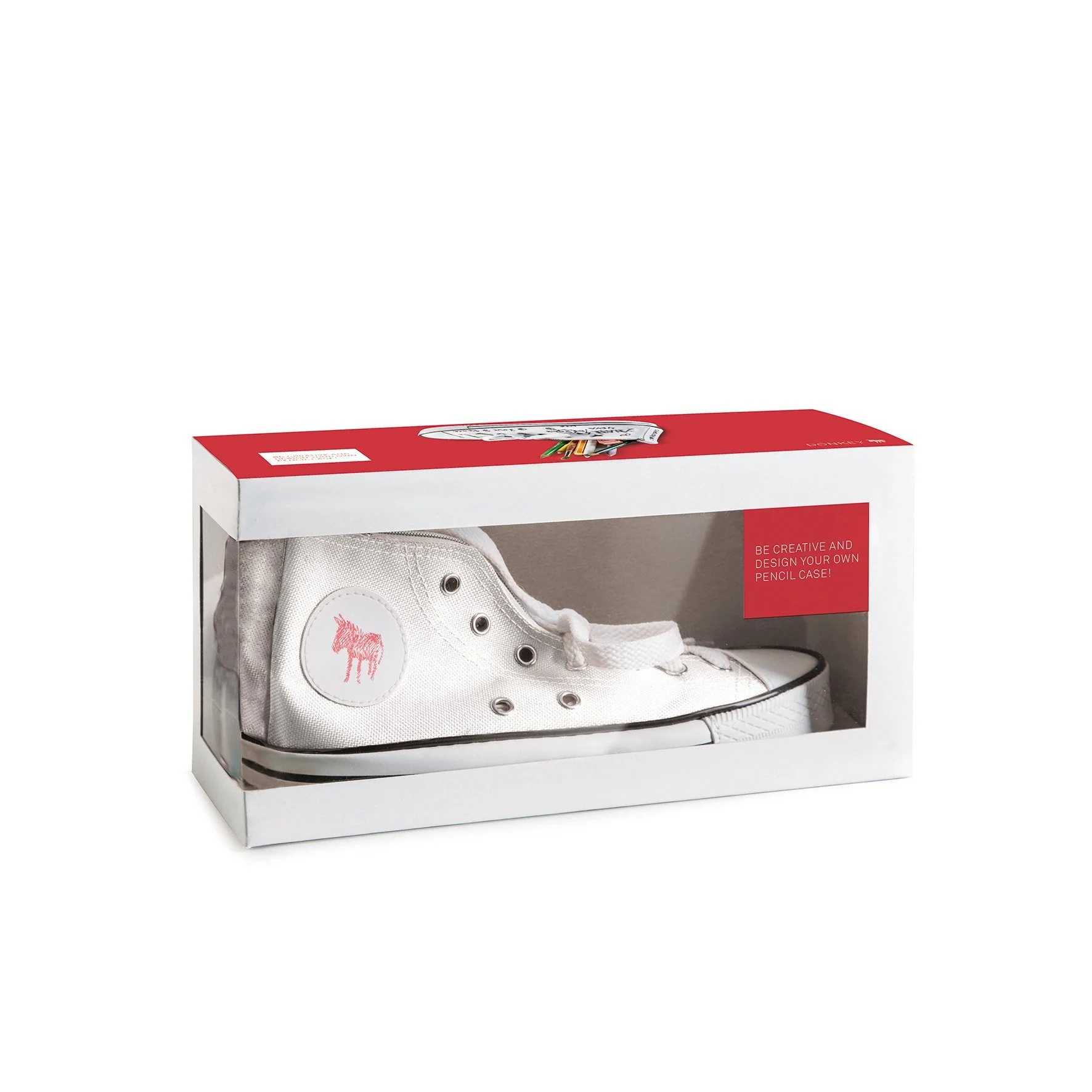 The Donkey Doodle pencil case in RED or WHITE not only impresses with its deceptively real similarity to the original. The practical storage space for office utensils inside also convinces in full line! You shouldn’t miss this sneaker!