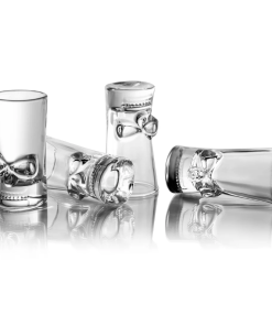 - Fill decanter and shot glasses with liquor to enhance the detail of the skull.