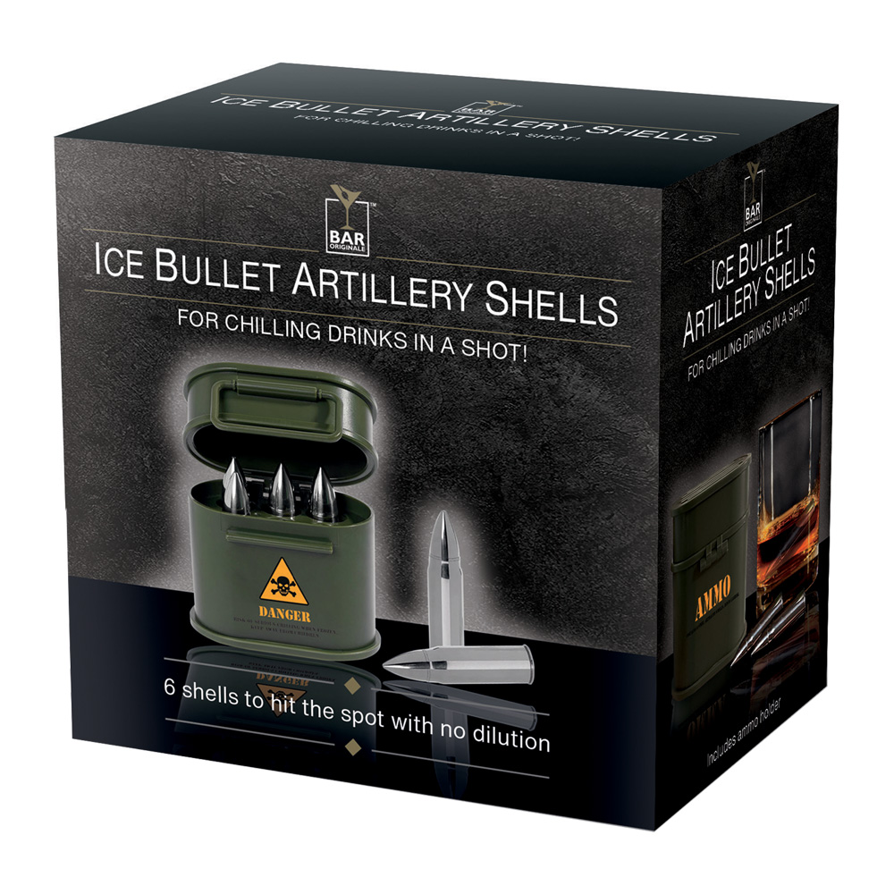 Introducing Bullet Ice Cubes in Ammo Case – a must-have for party supplies and giftware retailers. These 6 silver-finished, bullet-shaped metal ice cubes are filled with special freezable gel. Perfect for chilling drinks without diluting flavours, these unique ice cubes add a fun twist to any beverage experience. Store these bullet ice cubes in the freezer and grab a few when ready. They’re great for parties and gatherings, appealing to military enthusiasts and novelty seekers. Packed in an authentic-looking Ammo case, these ice cubes make an exceptional gift option. The visually appealing colour gift box adds to the presentation.