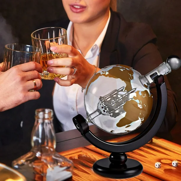✔ ENHANCE YOUR HOME BAR with this unique complete elegant whisky decanter set, includes an etched gold globe decanter masterly arranged on a CLASSIC MAHOGANY WOODEN TRAY