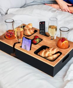 With three spacious, dishwasher-safe compartments for snacks and small bites, cleanup is a breeze. Keep your drinks close with secure glass holders, featuring a special slot to keep your glass steady. Your phone stays safe and easily accessible in its own dedicated slot, while a separate holder is perfect for your water or wine bottle. The extra central pocket provides space for any other essentials, from remote controls to reading glasses.