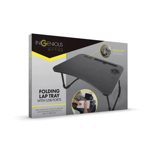 The InGenious Folding Lap Tray with USB Ports! This portable lap desk features optional stands for added convenience. With a 4 USB hub, power your devices with ease. Enjoy the in-built drinks holder and tablet stand for hands-free viewing making it great for work or play!