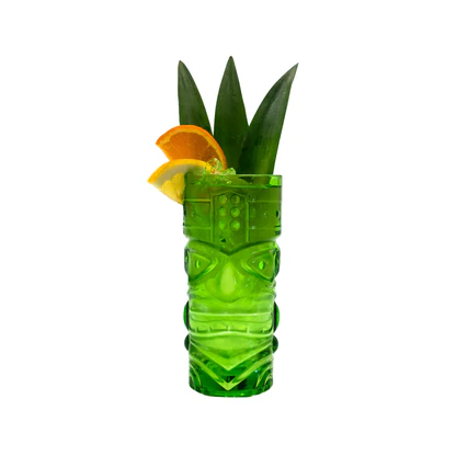 A fun sturdy green glass tiki glass that holds 14 fluid ounces. Great for cocktails!