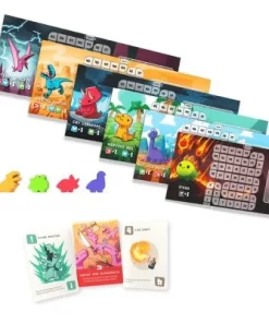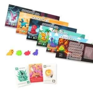 Player boards include your Dinosaur’s traits, an Escape Route you use to track your score, and a Disaster Area where you will collect Disaster cards. Player boards include your Dinosaur’s traits, an Escape Route you use to track your score, and a Disaster Area where you will collect Disaster cards. You’ll move your Dinosaur meeple along the Escape Route on your player board to track your score. Will you successfully dodge the disasters or get eaten by a prehistoric whale? Only the cards can decide.