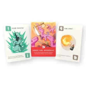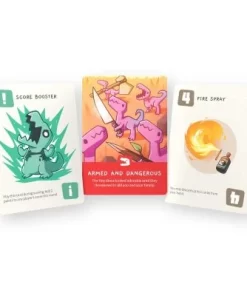 You will work to avoid all of life’s little disasters and laugh as they happen to your friends. If you collect 3 Disaster cards of the same type OR 3 different types of Disaster cards, you will be out of the game. Point cards feature weapons, trinkets, and good luck charms that you use to collect points and avoid disasters. Each card has a point value between 0 and 9 that you will use when scoring a round. You can use Instant cards at different points during the game to tip the odds in your favor or save your Dinosaur from certain death.