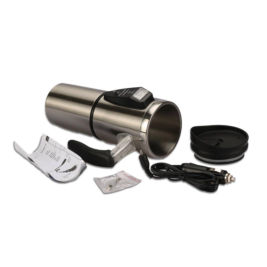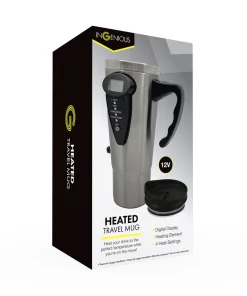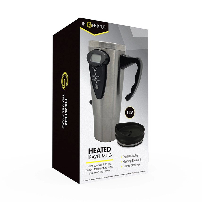 This stainless steel travel mug has a built-in element that lets you set your preferred heat level. It includes a car charger and a non-spill lid!