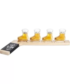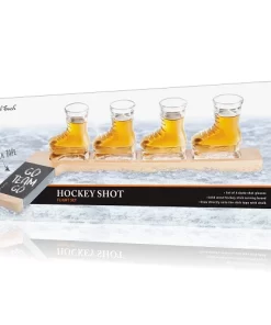 - Includes: 4 Skate shot glasses & solid wood hockey stick serving board with tape chalkboard.