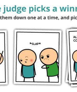 Draw 7 cards. The deck plays the first card, select a Judge to play the second, then everyone selects a third card to create a three panel comic strip. The Judge picks a winner.