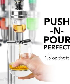 Give a toast with this four bottle revolving liquor dispenser. Your liquor of choice is gravity fed into each of the four dispensers. Simply push up to dispense a perfect 1.5 oz. shot every time. Each dispenser has a built-in ambience LED light for low light conditions. The weighted chrome finished base will look great in any setting.