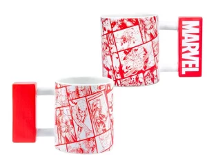 Large enough to quench the thirst of any superhero, this amazing 450ml (15floz) officially licensed Marvel Logo Shaped Mug features a red on white full wrap-around comic strip design that shows some of your favourite Marvel characters in action. You will have great fun naming them all, and the Iconic Marvel Cinematic Universe logo handle sets this mug apart from all others.