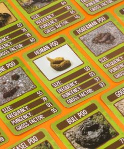 My poo is better than your poo. Intrigued? Play a game of turd one-upmanship with this set of 40 faeces-related trading cards. – 40 trading cards featuring poo
