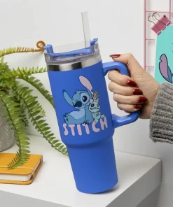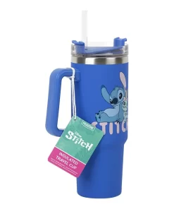Stay hydrated all day long with this Disney Stitch Travel Cup. The 900ml (30 fl oz) blue insulated soft-touch tumbler will keep your drink cold or hot for hours. Its versatile multi-way lid has three convenient positions: a sealed straw opening, an easy-sip option, and a cover top for when you’re on the move. The practical comfort-grip handle makes for effortless carrying, and the narrow base is designed to fit snugly in car cup holders. Not suitable for dishwasher or microwave use. Keep the Stitch Travel Mug always by your side for sipping throughout the day.