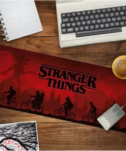 The black and red rubber desk mat features the Stranger Things logo against a rural Hawkins scene. Along the bottom of the mat are silhouettes of six of the main characters on bikes – Lucas, Mike, Eleven, Dustin, Will and Max. The Demogorgon lurks in the background.