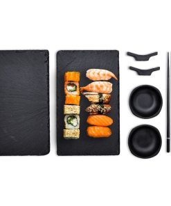 Enjoy sushi at home with our amazing Sushi Set For Two. This stylish matte black set has what you need for a pleasant experience for two—2 pairs of chopsticks, 2 slate serving plates, 2 soy sauce bowls, and 2 chopstick resting plates. Made of durable and sturdy restaurant-quality material, this set is built to last. Unlike ceramic sets that can easily break, this set is designed for years of enjoyment. It is easy to clean and dishwasher-safe (excluding chopsticks). The set comes in a beautiful, elegant packaging, making it a perfect gift for sushi enthusiasts!