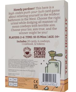 - Survive the Wild West Bathroom: This here is a high-stakes push-your-luck card game about relieving yourself in the wildest bathroom in the West! In Texas Hold It, 2 to 6 players risk it all to choose the right urinal while dodging all manner of mean cowboys with terrible aim. Be sly and stay dry!