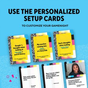 PERSONALIZED GAMEPLAY. Customize the content with the help of the personalized setup cards. Fill in the blank with the name of a player, a celeb, or someone you all know for even better laughs. Bonus: this makes the Audio Game’s replayability endless.
