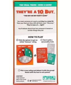 - How To Play: Start the game by spinning the spinner to get your imaginary date’s baseline hotness, and then pair it with a trait card. All players share their ratings (and defend their taste!) Anyone whose answer matches the judges wins a point.