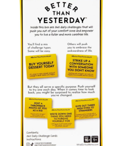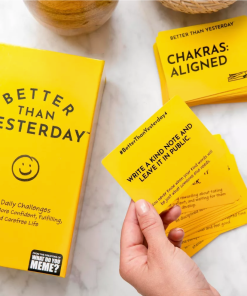 Do your days consist of the same routine? Wake up, work/school, watch TV, go to bed, rinse, repeat? If so, Better Than Yesterday is the game for you. This year-long self-improvement challenge is here to help you get out of your comfort zone and shake up your day-to-day. It’s the wellness challenge AND routine energizer that you’ve been looking for. Simply draw a card each morning and push yourself to complete the given challenge! You don’t know where you’ll end up, but you’ll be amazed by how much you grow along the way. Give it a try. You just might love it. Brought to you by What Do You Meme?® in collaboration with Case Kenny, creator of the “New Mindset” movement.