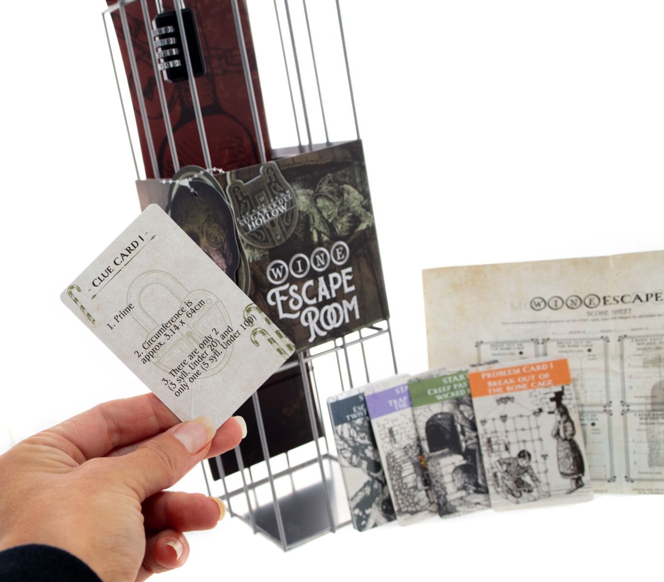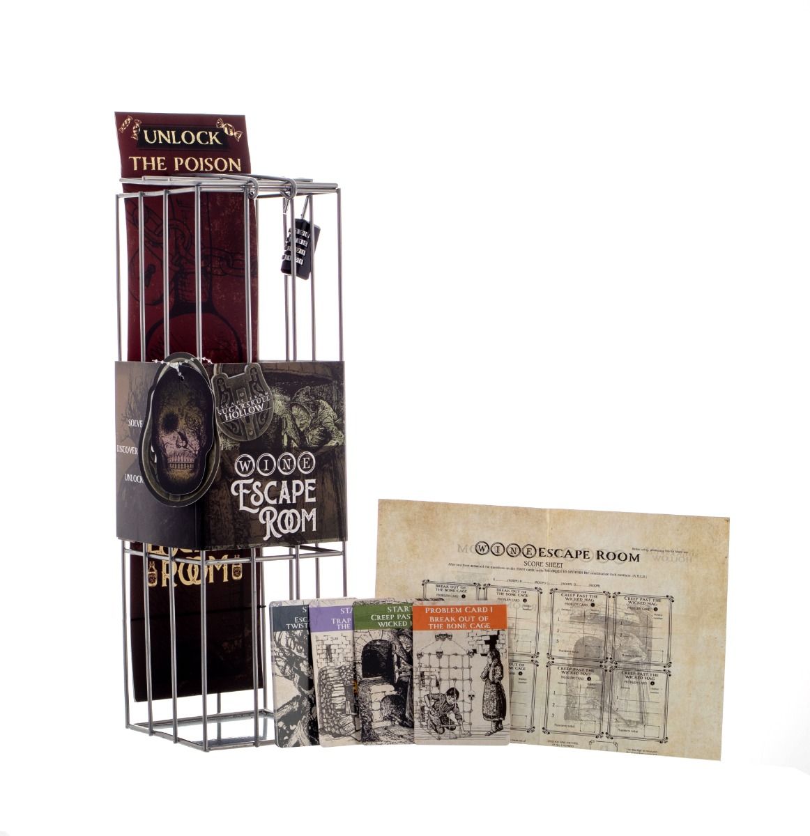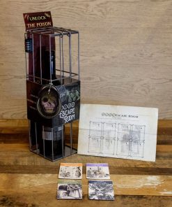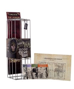 Solve the clues. Discover the hidden code. Unlock the poison. Enticed into a sickeningly sweet cottage deep inside a twisted forest by an evil witch, you soon realise you must escape if you want to live. You notice the evil hag has drifted off to sleep…now is your chance! Can you creep through the corners of the house, solve the clues and unlock the poison to escape the evil fate granny has planned? Embark on this journey and work together through cryptic riddles to piece together the code for the padlock, to kill the witch and escape to freedom! With four dark and creepy ‘rooms’, you must answer all the questions and riddles on the playing cards correctly, then fill in the score sheet and decipher the locked 4 digit combination! Complete with 54 escape room cards, a 4 digit combination padlock and a score sheet, all packaged within a metal wine cage, this creepy twist on a classic escape room is the perfect novelty gift for puzzle lovers (and wine drinkers) on their birthday or Christmas! Simply add a bottle of your choice, lock the cage, and let the games begin… (Poison not included!)